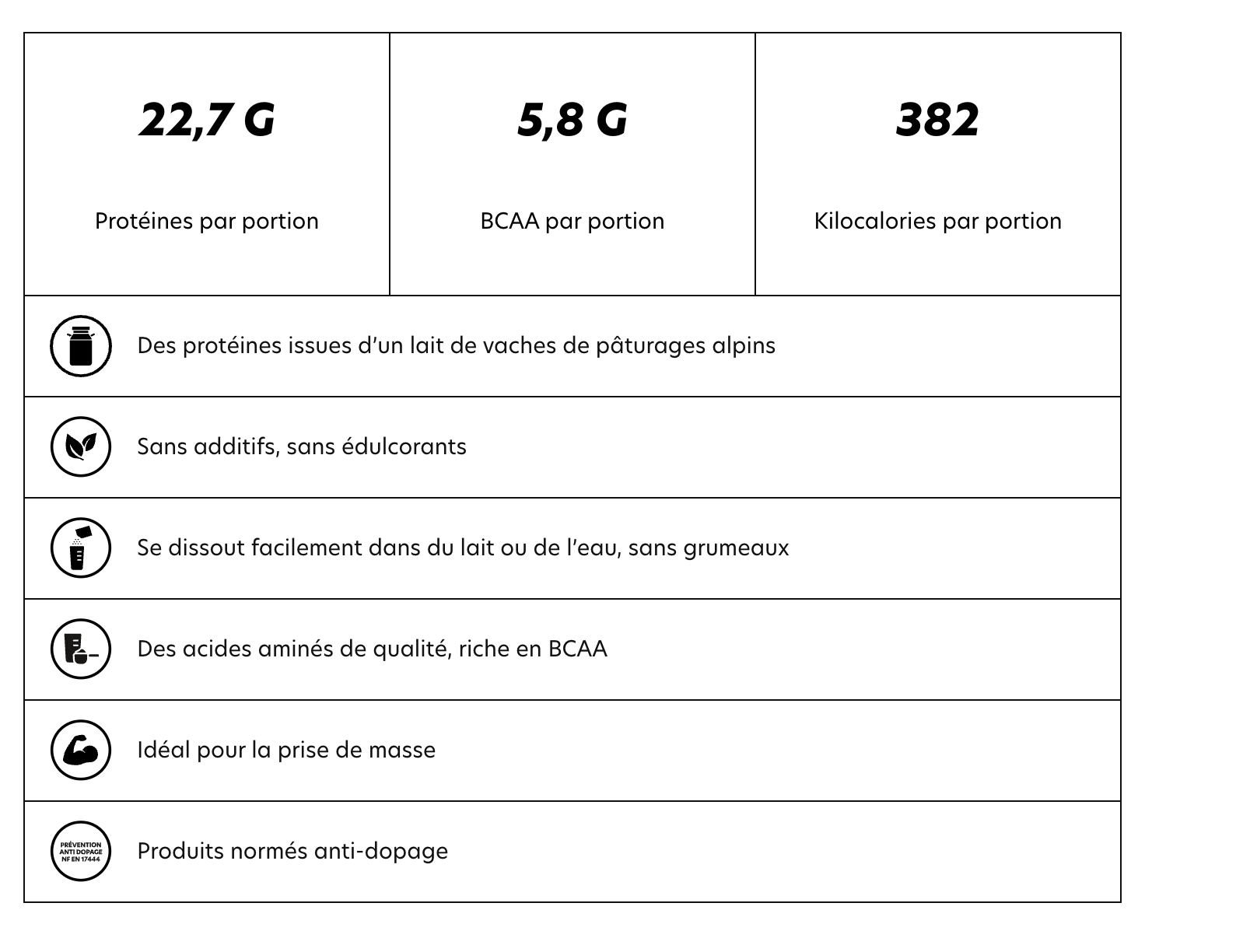*Dans le cadre d’une prise de masse, évitez de consommer le Mass Gainer avant un repas. En effet, l’effet coupe faim pourrait diminuer la quantité consommée lors du repas classique. Privilégiez une prise à distance du repas (avant), ou en dessert..