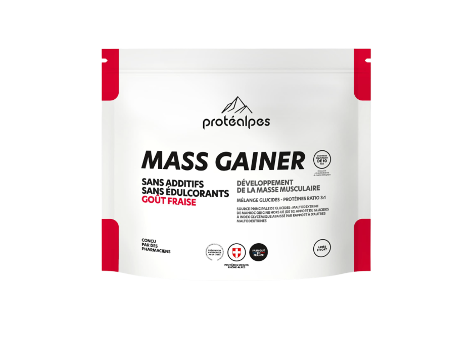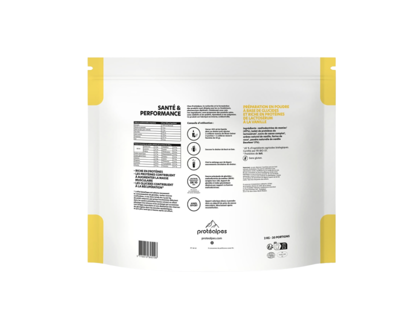 Mass Gainer – Vanille – 2 kg par Protéalpes. Sans additifs, sans édulcorants et made in France ! Certifié sans substances dopantes et sans gluten. Plusieurs saveurs et plusieurs packs disponibles. Produits développés par des pharmaciens pour les athlètes en quête de performance.